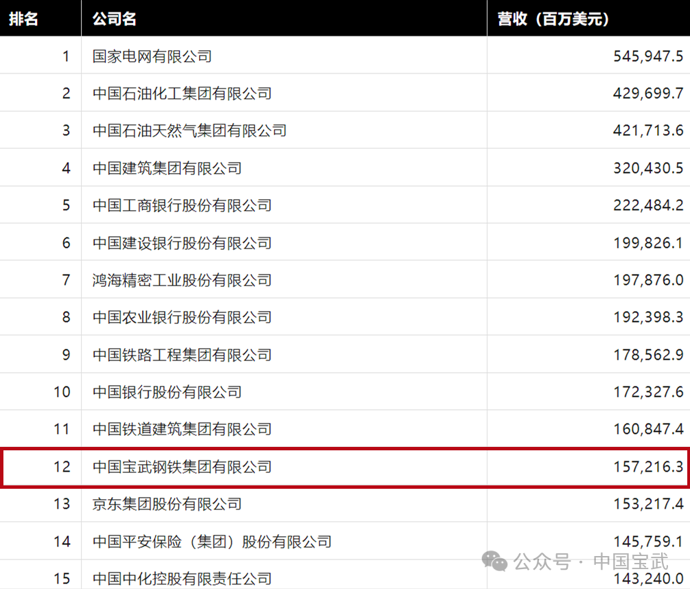 7月25日,2024年《财富》中国500强排行榜揭晓,宝武以157,216.3百万美元营业收入,位居第12位,比上年提升2位。